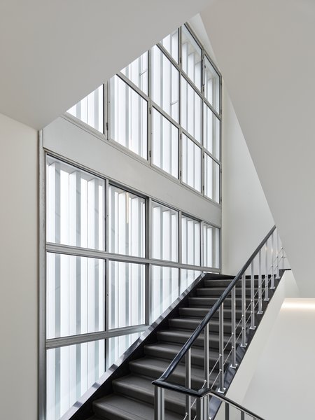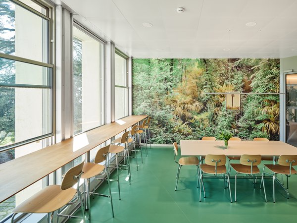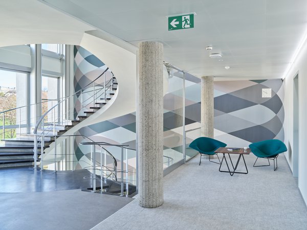 Die Erschliessungs- und Verbindungsbereiche zwischen den beiden Gebäudefluegeln wurden neu gestaltet, um die veränderten Arbeitsweisen zu unterstuetzen. Der gezielte Rueckbau von Trennwaenden, die Integration von Glaswaenden sowie die vollstaendige Erneuerung der technischen Installationen staerken Transparenz, Komfort und Nachhaltigkeit – unter strikter Wahrung des denkmalgeschuetzten Bestands.