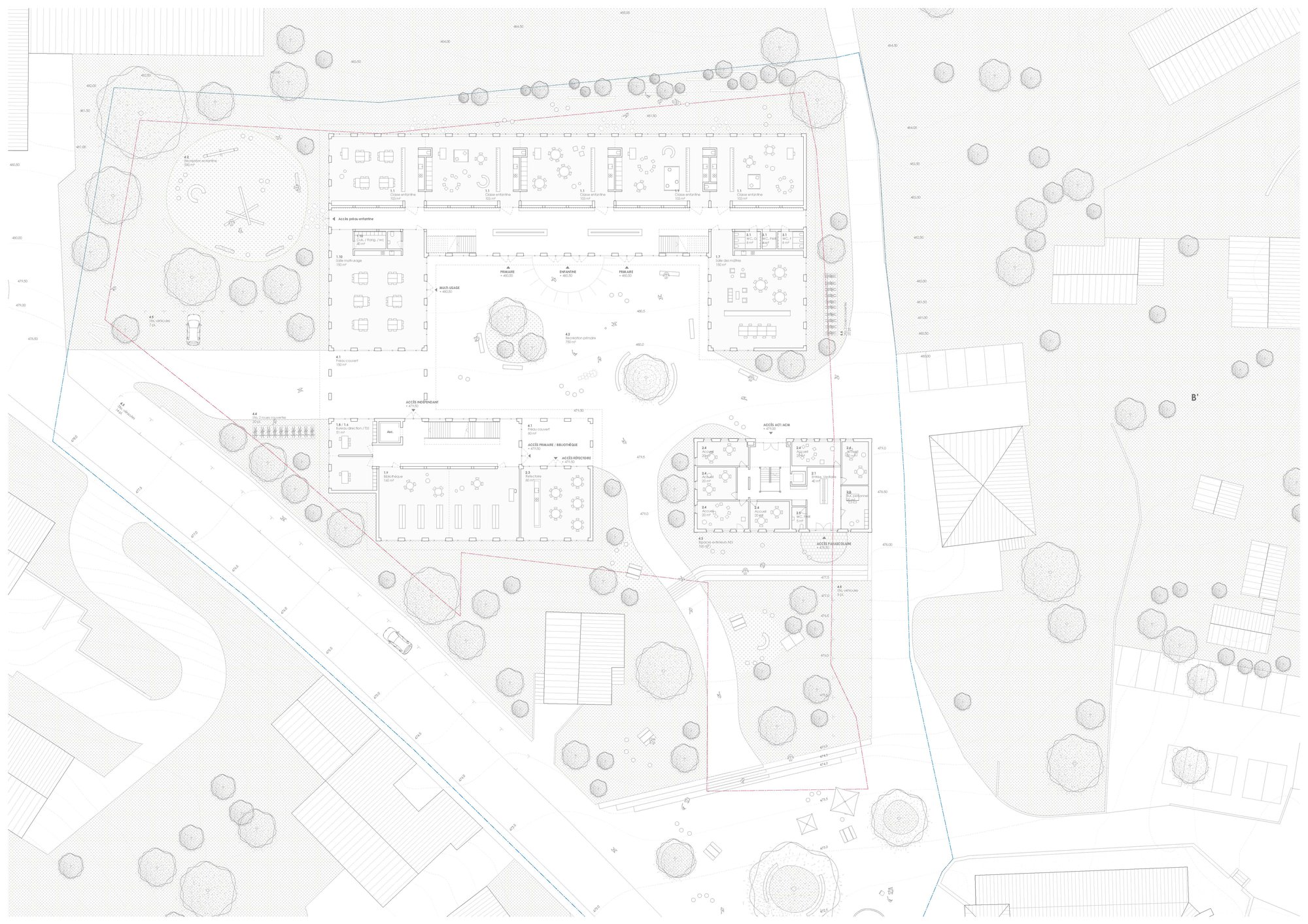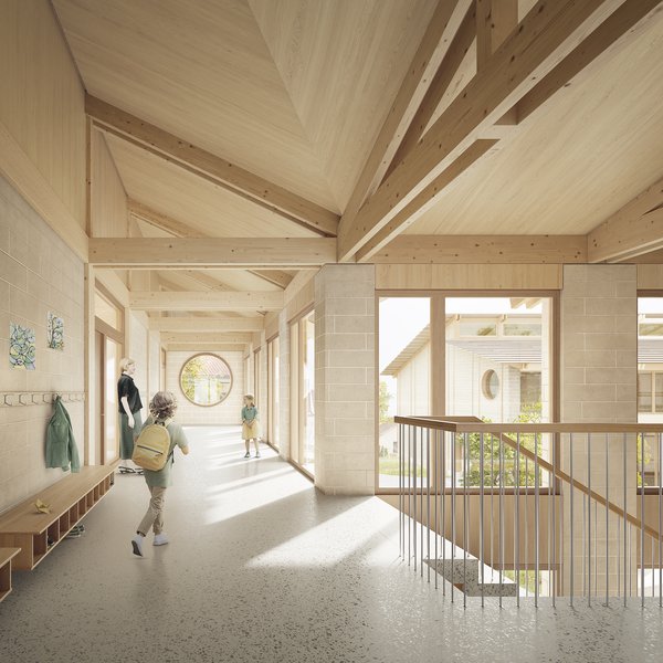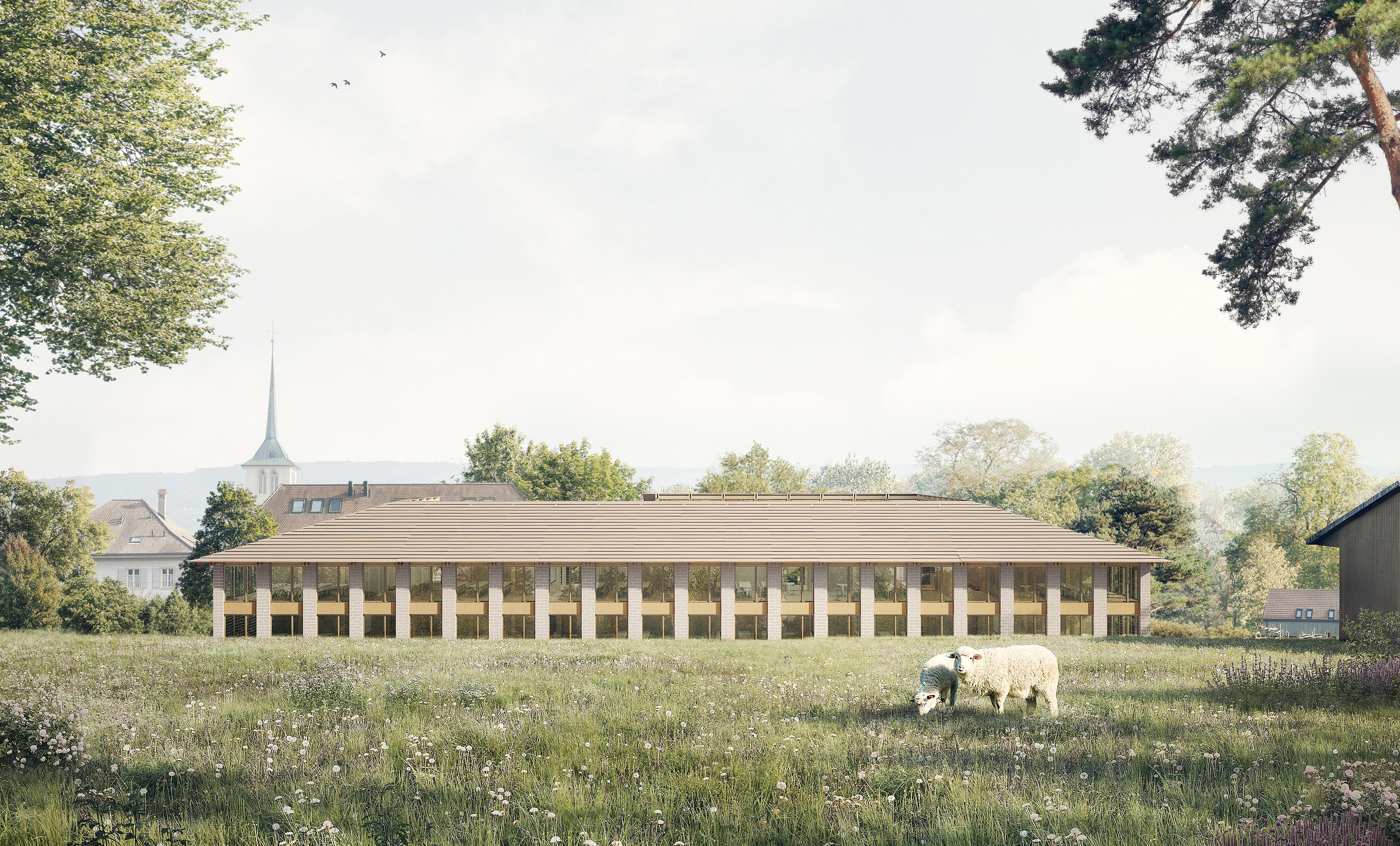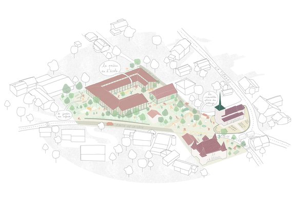 Die Schule entwickelt sich als niedriger Baukörper, organisiert um einen zentralen Hof. Diese Anordnung ermöglicht die vollständige Integration der bestehenden Ferme und schafft ein kohärentes und verbindendes Ensemble.