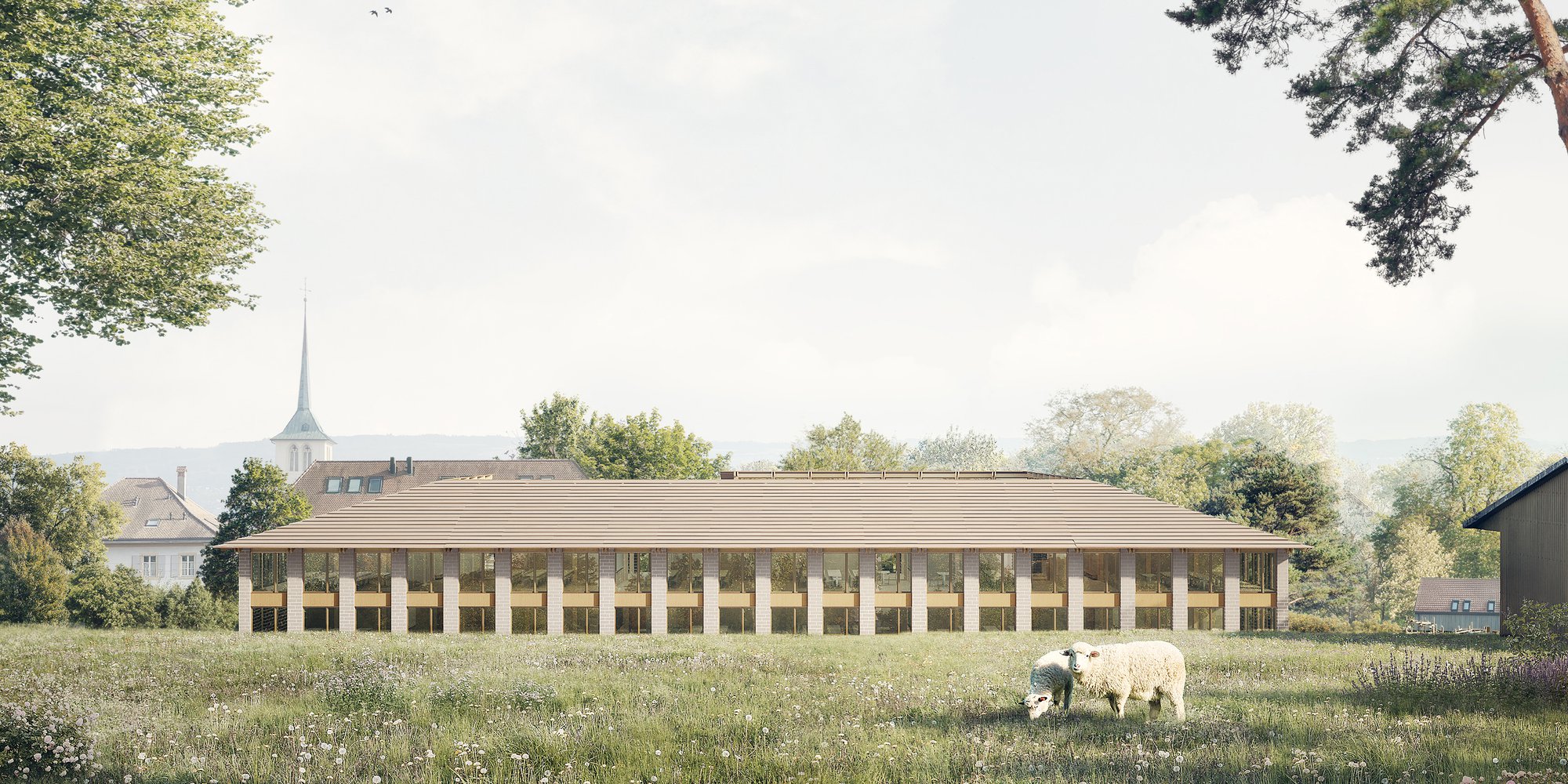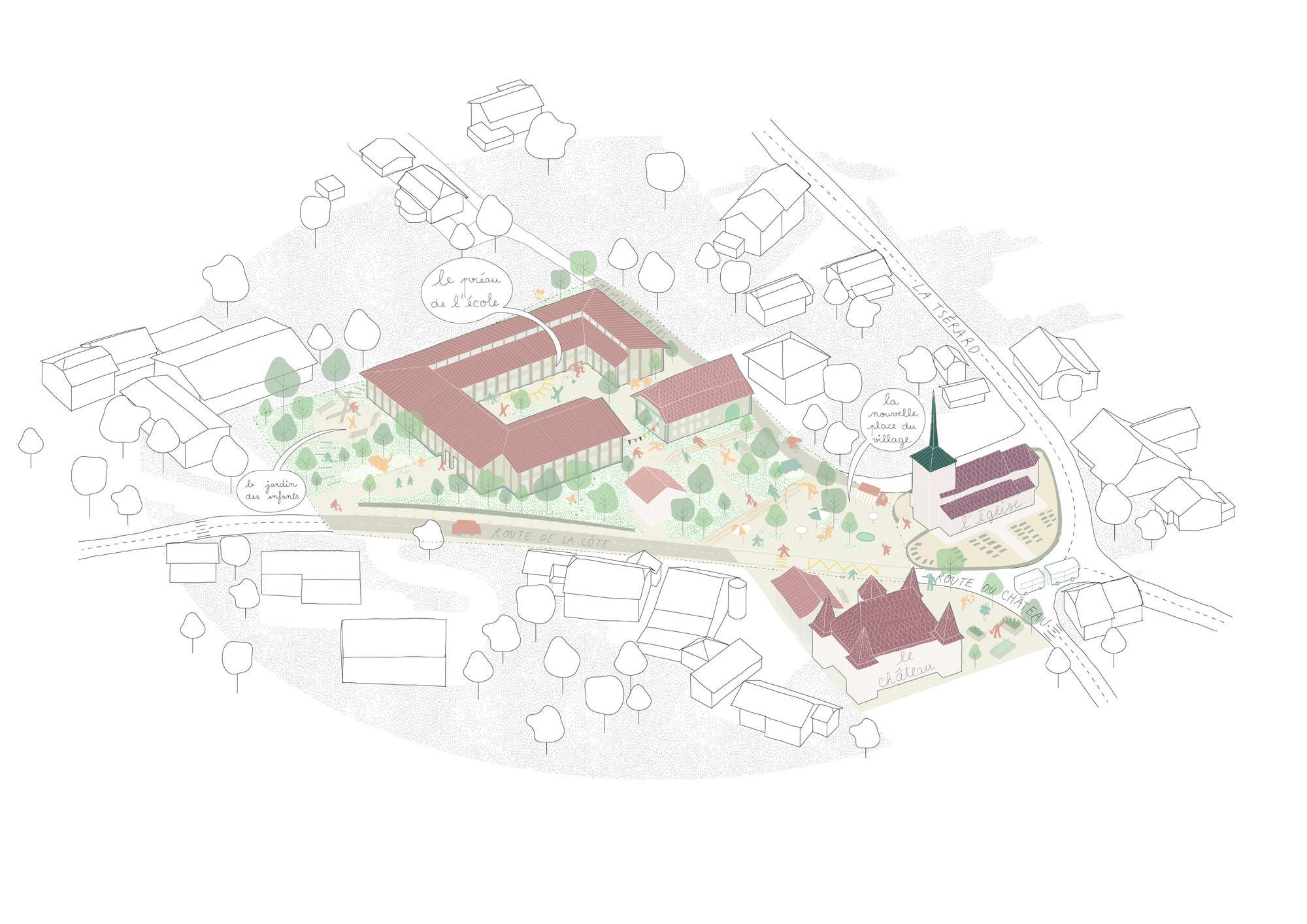 Unser Projekt La ligne des toits wurde im Rahmen des Wettbewerbs für die Neugestaltung des Schulareals Saint-Aubin mit dem ersten Preis und dem zweiten Rang ausgezeichnet. Der Standort ist geprägt durch markante identitätsstiftende Gebäude wie die Kirche, das Schloss und die historischen Bauernhöfe. Vor diesem Hintergrund verfolgt das Projekt eine zurückhaltende und sorgfältig ausbalancierte Haltung, die sich in die bestehende Dorfstruktur einfügt.