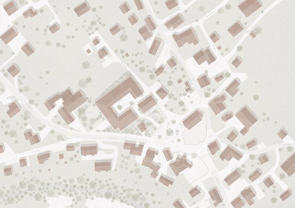 Die Zugänge sind klar strukturiert, die Wegeführung ausgewogen organisiert und die Erschliessungen von Licht durchflutet. Das gesamte Ensemble wird von einer schlichten, mineralischen Architektur getragen, die durch ein geneigtes Dach akzentuiert wird. Dieses gestalterische Konzept prägt die Identität des Gebäudekomplexes und fügt sich harmonisch in das Dorfbild ein.