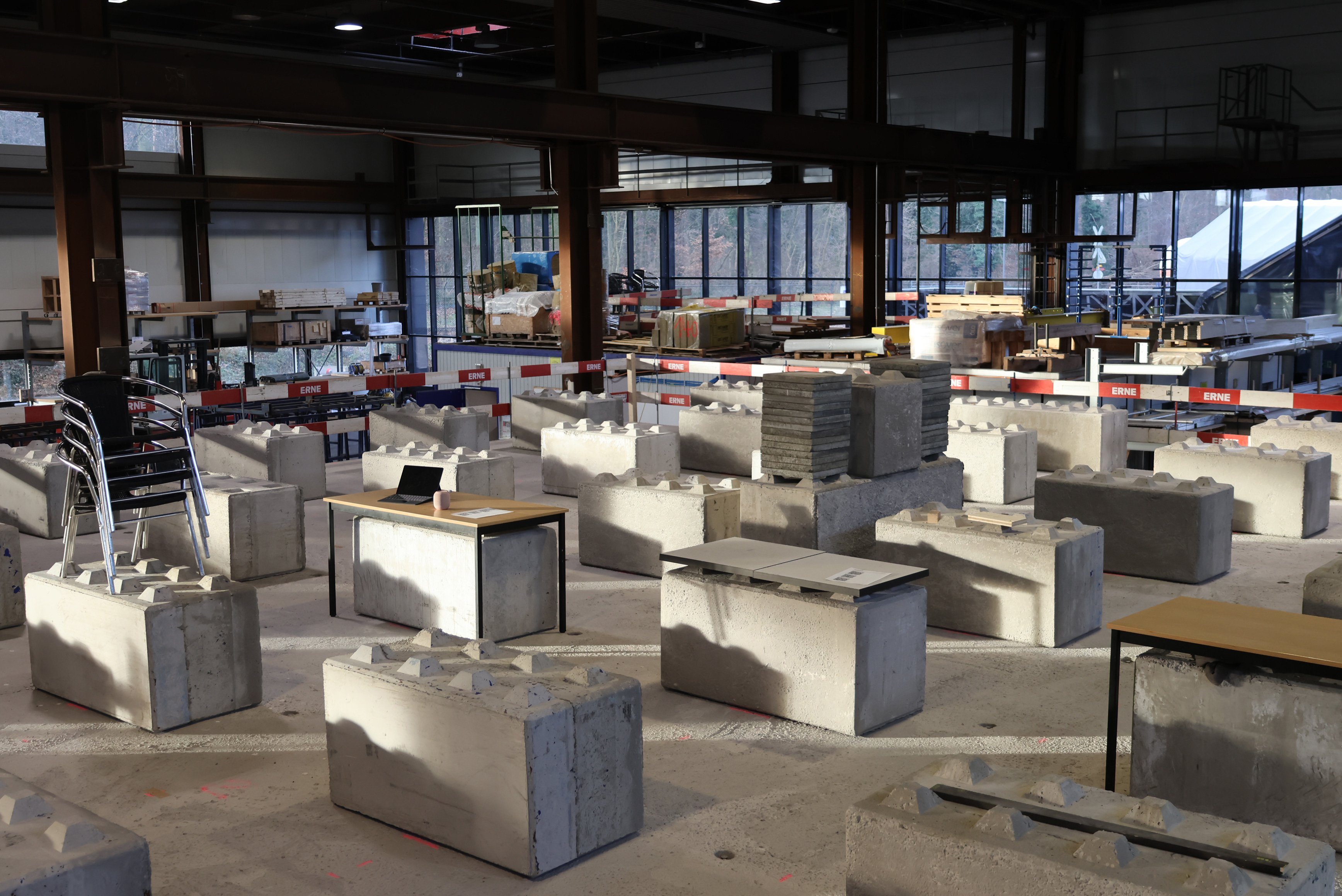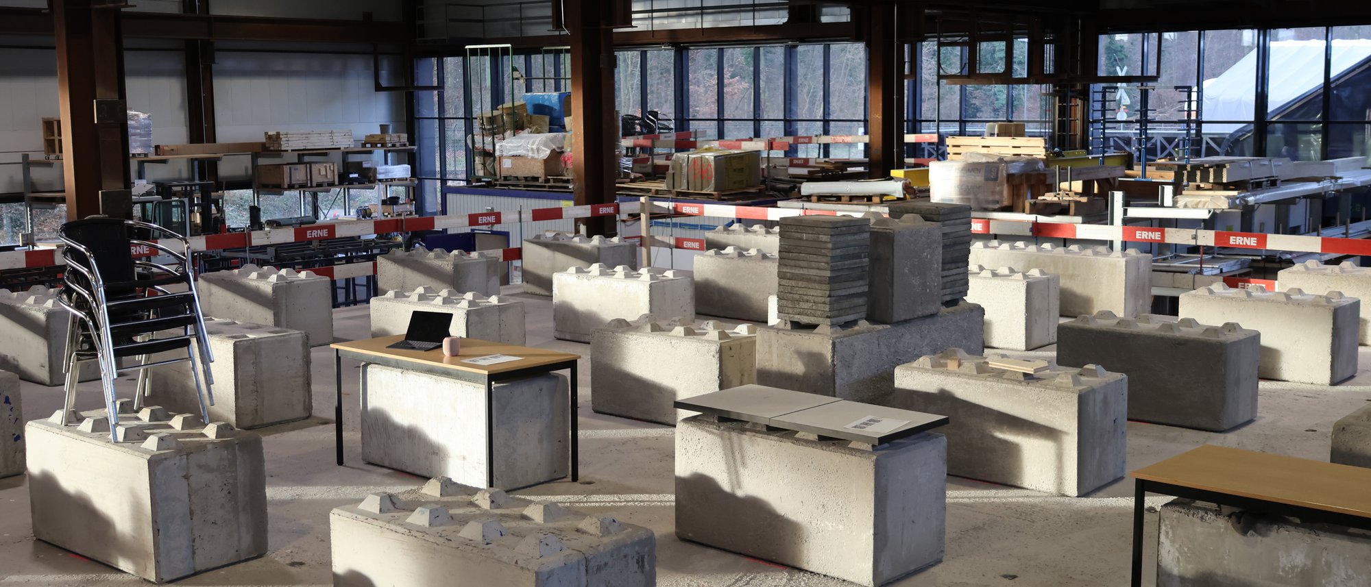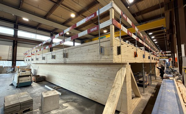 Der im Unternehmen Erne Holzbau in Rheinfelden installierte Prüfstand bildet die Spannweiten des Dock A exakt nach. Während der Testphase werden verschiedene Varianten simuliert, um Tragverhalten und Komfort unter realen Lastbedingungen zu analysieren. Die Konstruktion basiert auf Holz-Beton-Verbundelementen, die hohe Tragfähigkeit und Ressourcenschonung vereinen. Ein externer Schwingungstilger wird zusätzlich getestet, um das Schwingungsverhalten weiter zu optimieren.