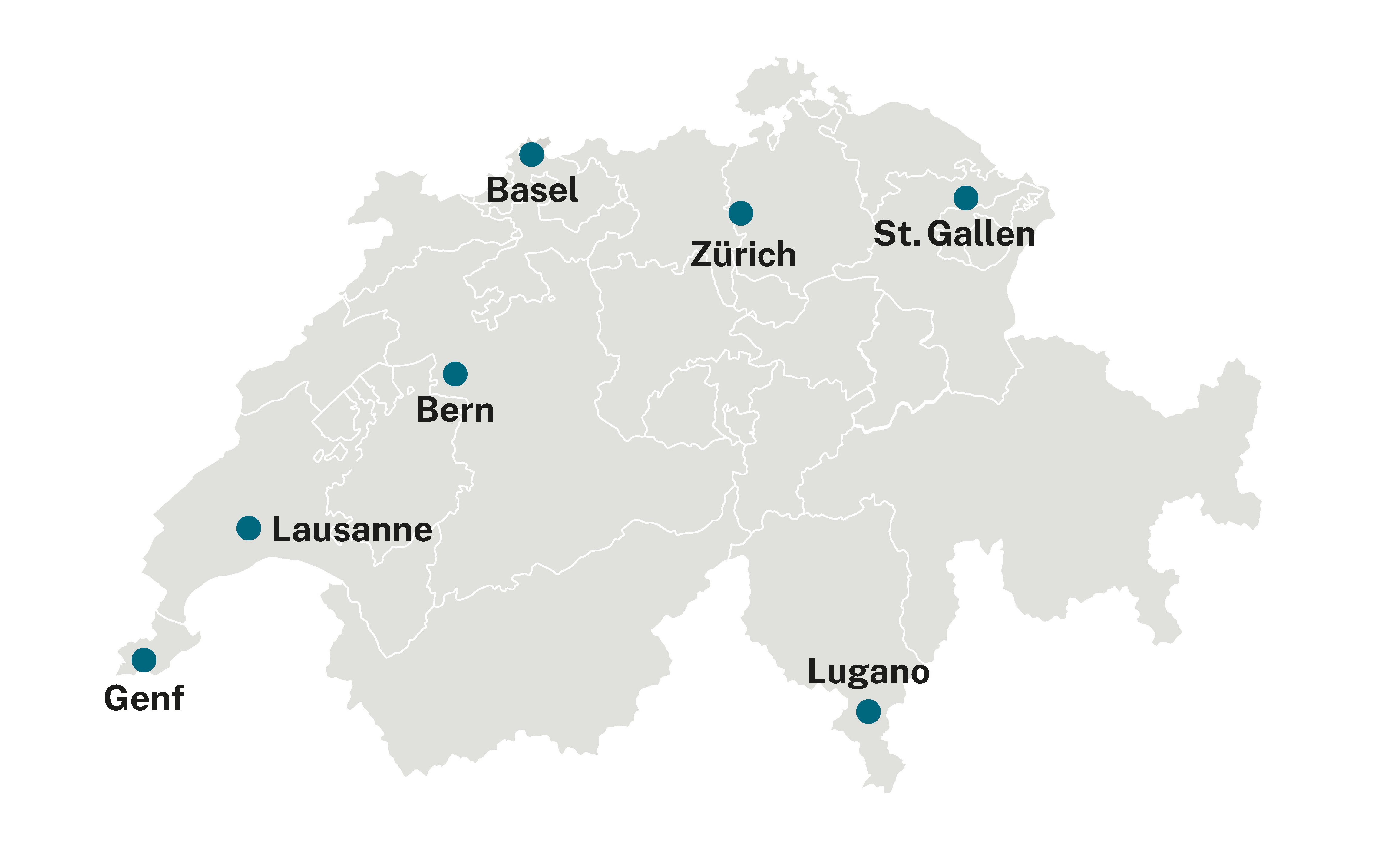 Mit rund 400 Mitarbeitenden aus der ganzen Welt sind wir an sieben Standorten in der Schweiz vertreten: Basel, Bern, Genf, Lausanne, Lugano, St. Gallen und Zürich.