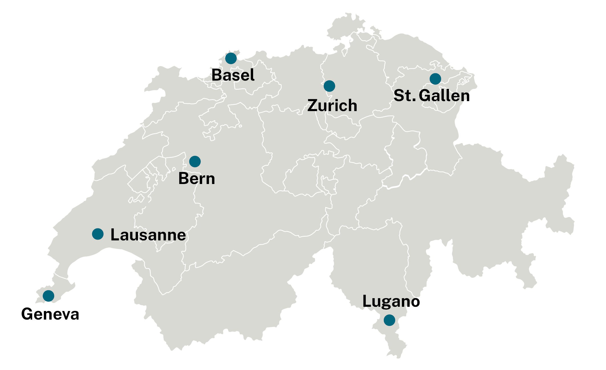 With around 400 employees from all over the world, we are represented at seven locations in Switzerland: Basel, Bern, Geneva, Lausanne, Lugano, St. Gallen and Zurich.