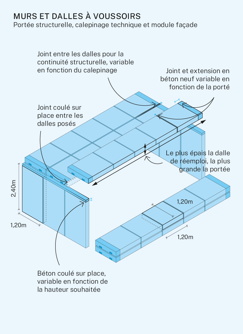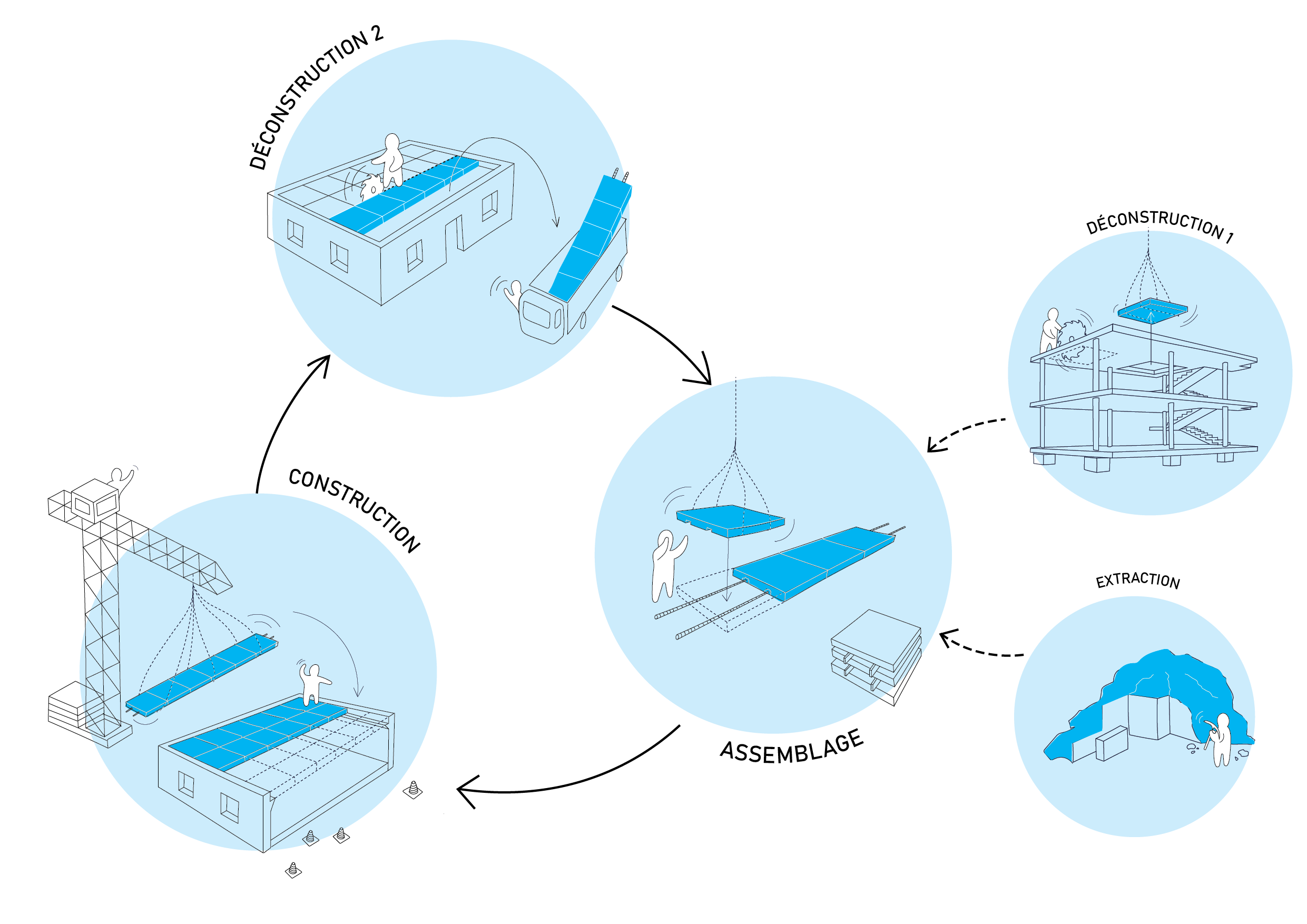 To address the technical and logistical challenges of deconstruction and reuse, the project proposes a standardized system for material extraction and preparation, inspired by proven construction methods. Elements are derived from a 2.4 m × 2.4 m module, shaped with grooves using simple tools such as a road saw and jackhammer, and then assembled and prestressed using standardized techniques. This standardization facilitates reproducibility and industrial scalability in line with circular construction principles.