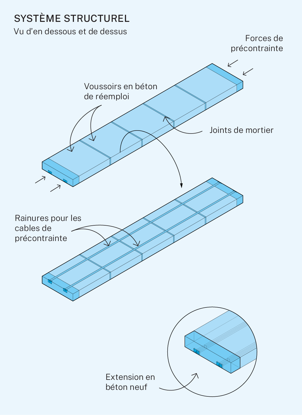 In collaboration with Cooperative 2401, VSL Switzerland, and Marti Construction, we developed an approach to avoid crushing concrete by directly using natural stone or reusing existing concrete: what if we cut, assembled, and prestressed low-carbon mineral elements sourced from quarries or deconstructed buildings to create a new modular slab system?
