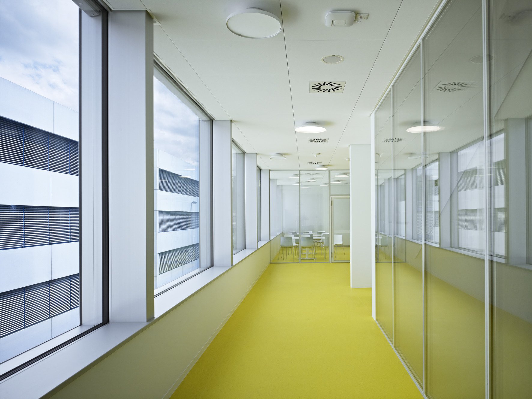 The lab building for quality control plays an important part in the release of Roche products. The architectural focus lies on ensuring that the modern analytical equipment functions perfectly and on creating flexible, modular structures with a view to future adaptations. The horizontal bands are the main feature of the simple, linear architecture of the building. The view from the outside is dominated by the high proportion of glass which creates rooms on the inside which are flooded with light. The CC façade is a system component of the overall energy concept of the building. The labs and evaluation areas are to be found on the first four floors. The large labs with their modular set-up are characteristic for the building. On the ground floor there are meeting rooms, a cafeteria and offices.