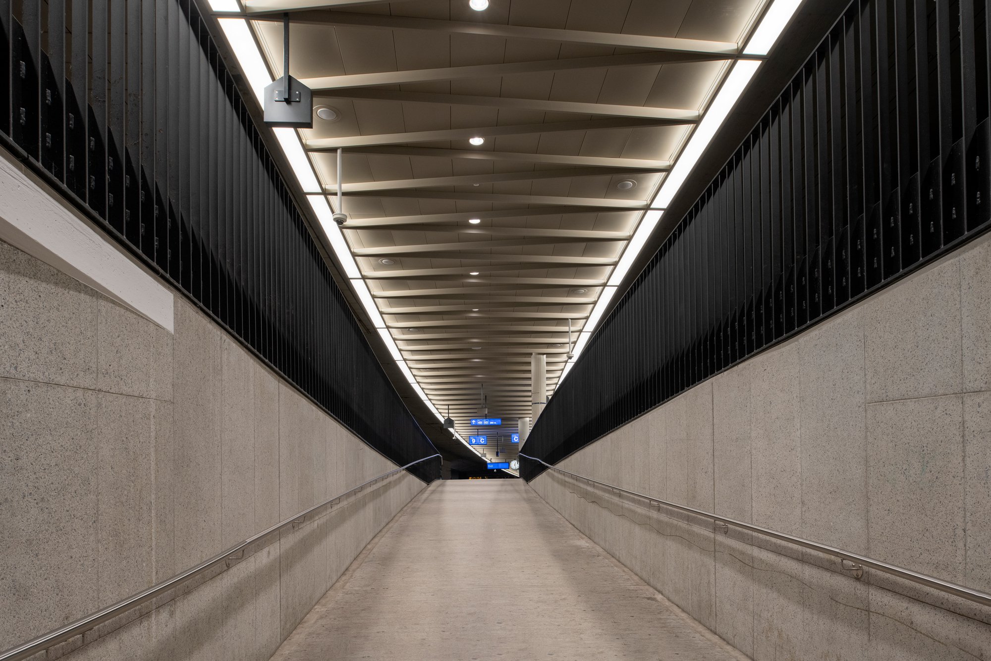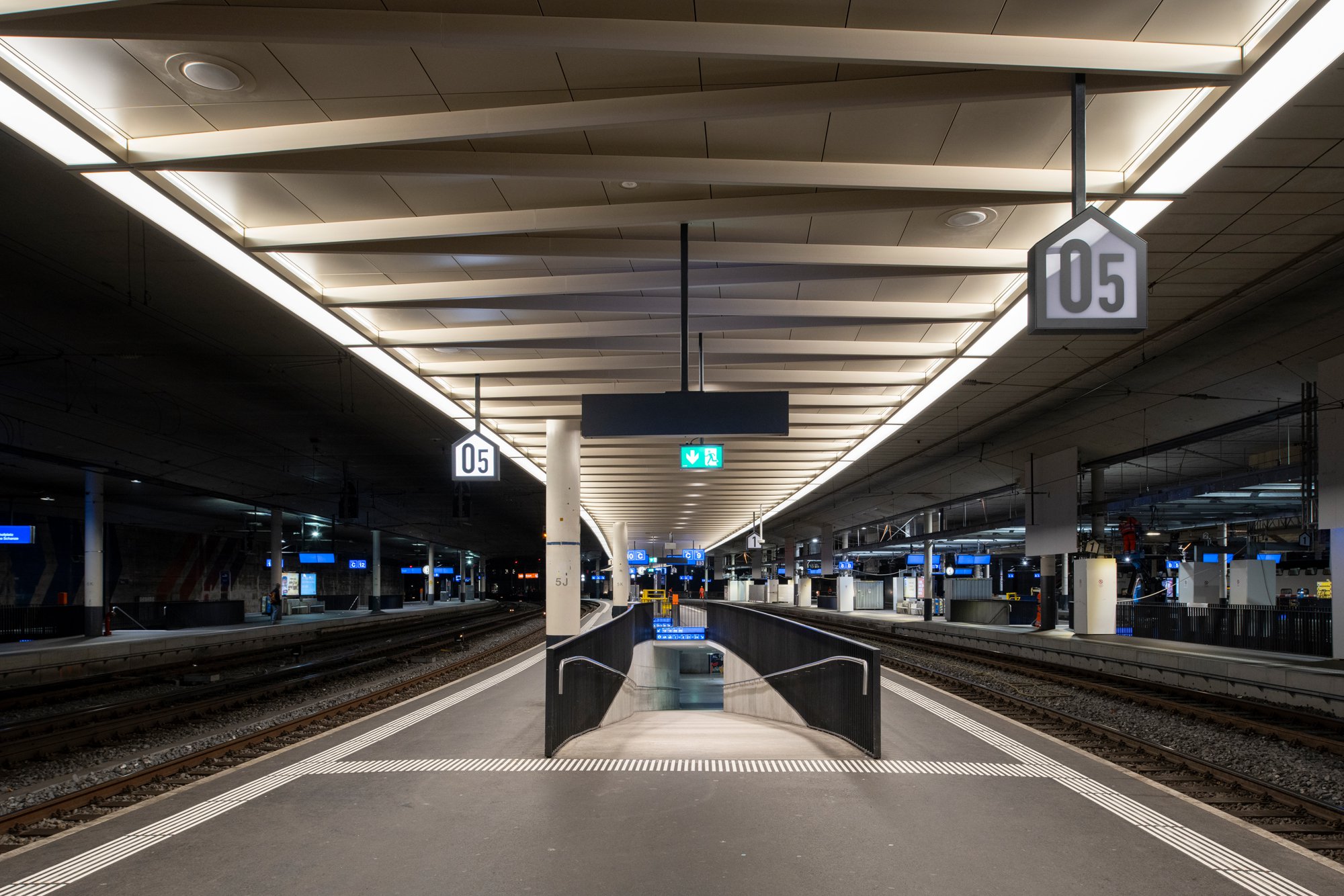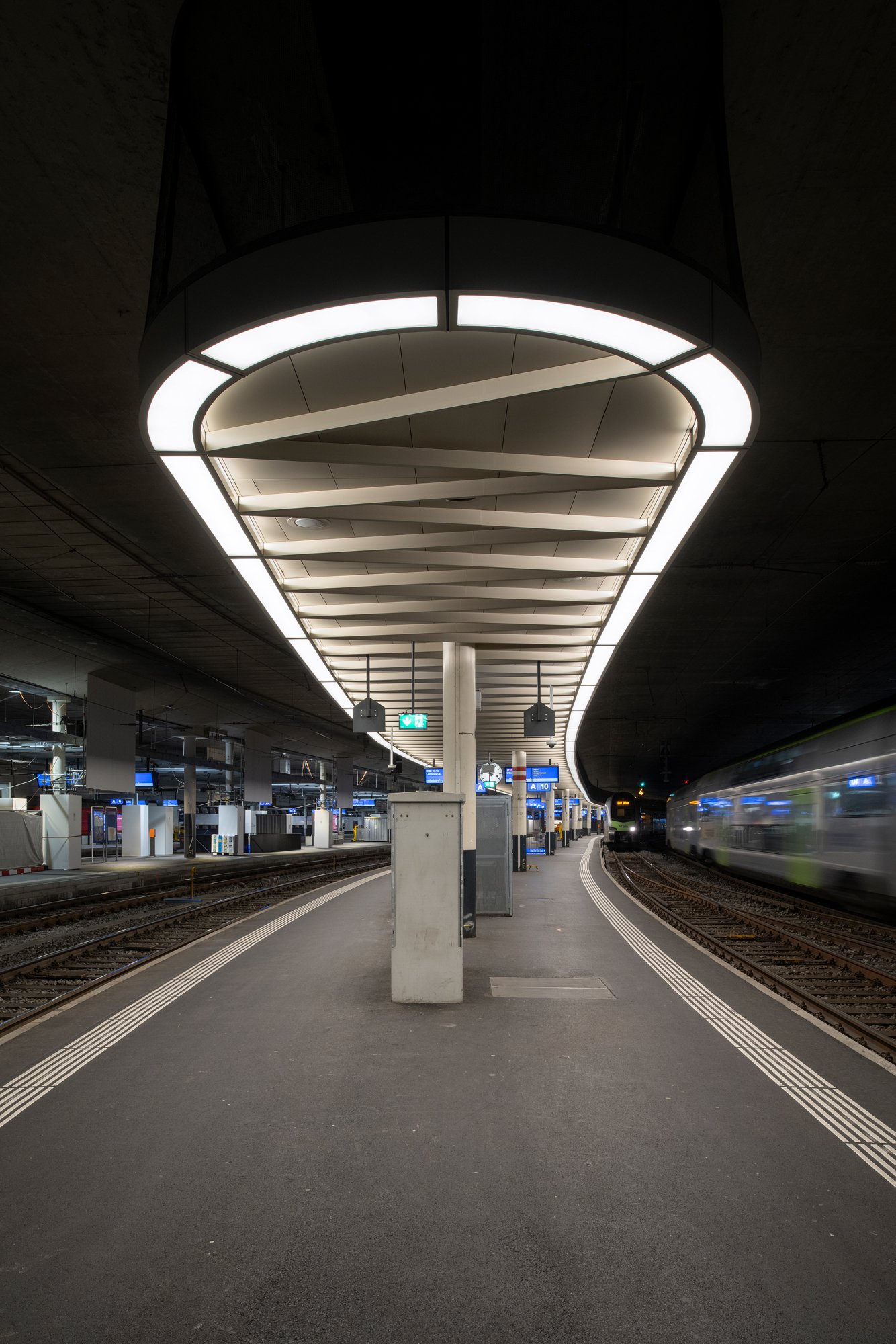 A key feature of the redesign is a series of multifunctional ceiling panels that integrate technical infrastructure while establishing a consistent, contemporary visual identity. Designed to accommodate the station’s complex platform geometries—curves, tapers, and structural grids—these panels also serve as a canopy, adding a human scale that enhances the spatial experience.