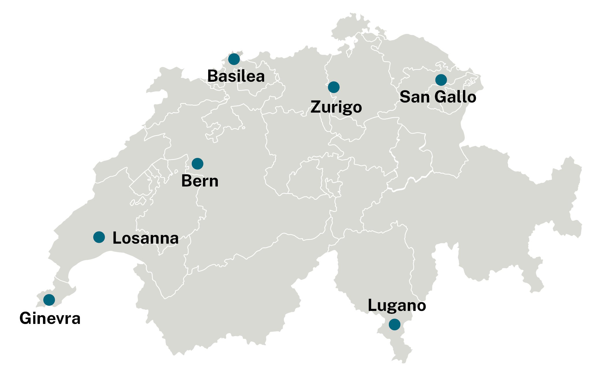 Con circa 400 collaboratori provenienti da tutto il mondo, siamo presenti in sette sedi in Svizzera: Basilea, Berna, Ginevra, Losanna, Lugano, San Gallo e Zurigo.